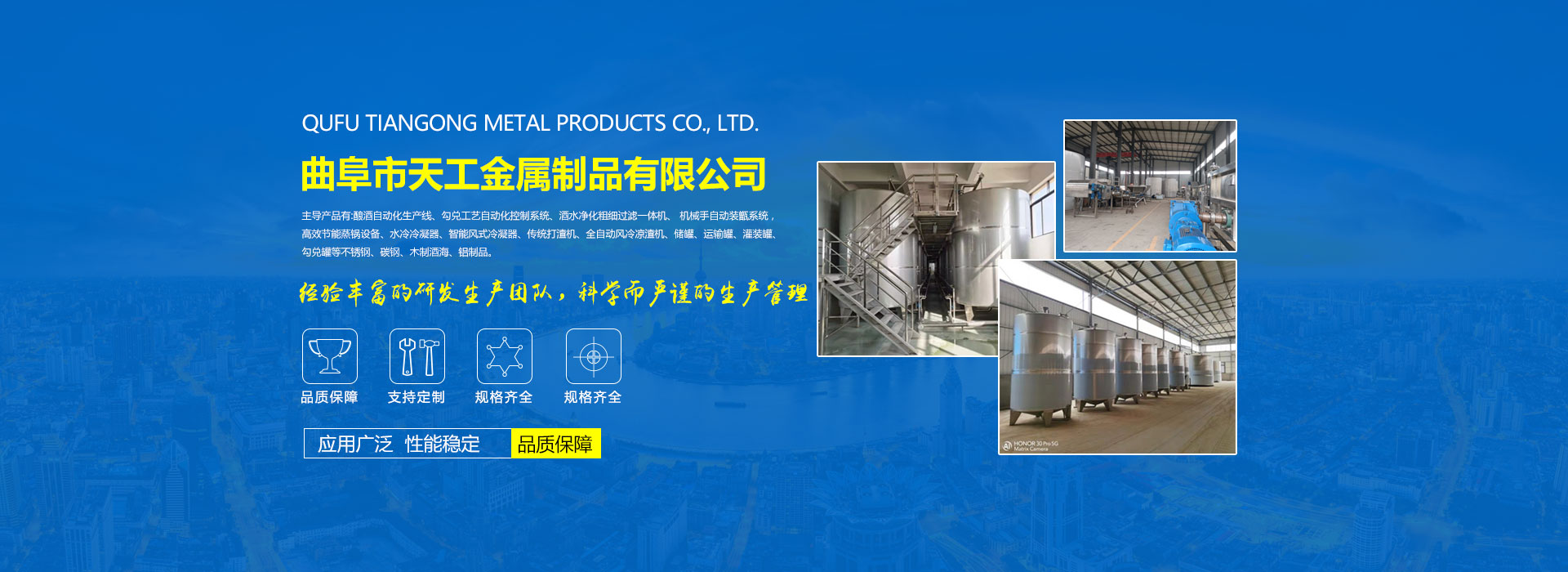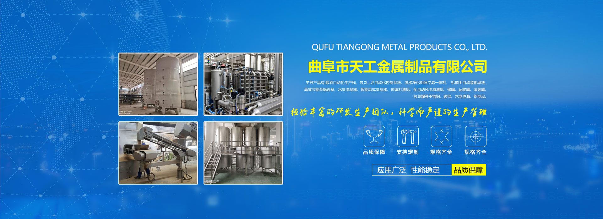 本公司是專業(yè)生產(chǎn)不銹鋼酒罐、不銹鋼釀造設(shè)備、不銹鋼發(fā)酵罐、釀酒、食品、生物、化工、環(huán)保設(shè)備、制藥設(shè)備的廠家。主導(dǎo)產(chǎn)品有:釀酒自動(dòng)化生產(chǎn)線、勾兌工藝自動(dòng)化控制系統(tǒng)、酒水凈化粗細(xì)過(guò)濾一體機(jī)、?機(jī)械手自動(dòng)裝甑系統(tǒng),高效節(jié)能蒸鍋設(shè)備、水冷冷凝器、智能風(fēng)式冷凝器、傳統(tǒng)打渣機(jī)、全自動(dòng)風(fēng)冷涼渣機(jī)、儲(chǔ)罐、運(yùn)輸罐、灌裝罐、勾兌罐等不銹鋼、碳鋼、木制酒海、鋁制品。各種反應(yīng)釜、發(fā)酵罐、提取罐、氣體混合罐、烘干設(shè)備等大中型設(shè)備安裝,平臺(tái)制作、工藝管線制作安裝,容器設(shè)備內(nèi)外防腐保溫。產(chǎn)品規(guī)格齊全,質(zhì)量可靠。